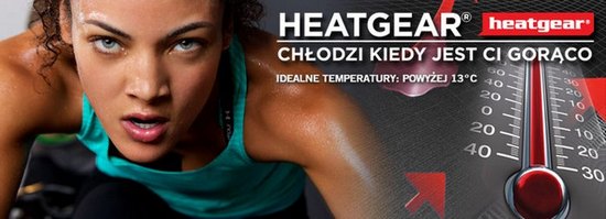 HeatGear® to lekka techniczna tkanina, która chłodzi i osusza ciało podczas uprawiania sportu. Transportuje pot z powierzchni ciała na zewnątrz tkaniny i przyspiesza jego odparowywanie. W rezultacie optymalizuje temperaturę ciała i utrzymuje je w świetnej kondycji podczas ćwiczeń, treningu czy sportowej rywalizacji.